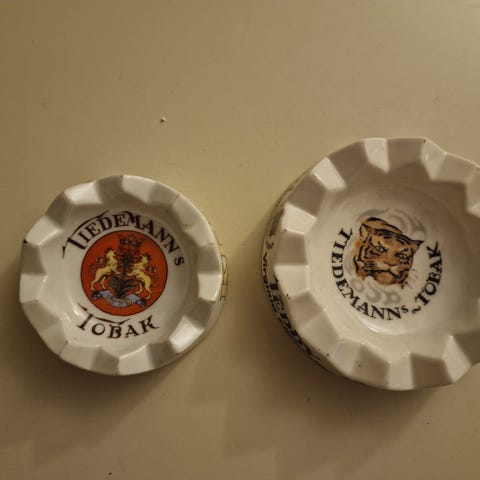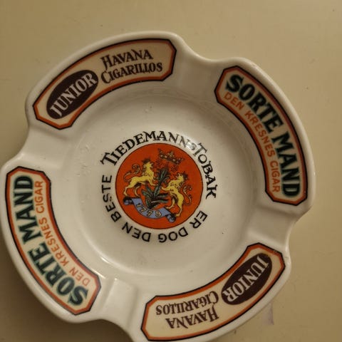 Dette er et klassisk askebeger fra Tiedemanns Tobaksfabrik, produsert av Porsgrunds Porselænsfabrik (PP). Slike gjenstander er ikke bare samleobjekter, men også små stykker norsk industrihistorie.