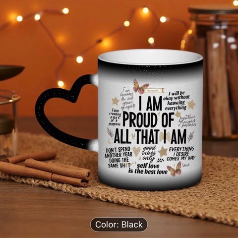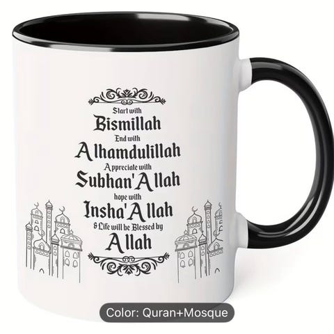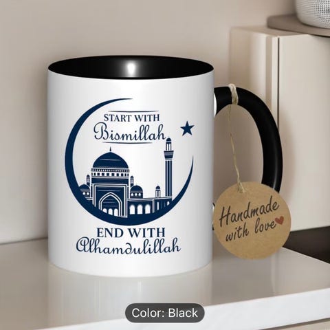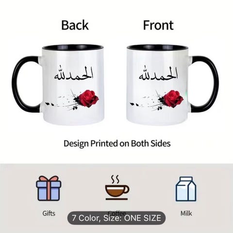 Ferm Living kopp med navn Khadija i rød og hvit farge. Koppen har trykk med navnet Khadija på både arabisk og latinsk skrift, samt en kort tekstforklaring under. Hanken og koppens kant er røde, mens resten av koppen er hvit. Egnet til servering av varme og kalde drikker på kjøkken eller kontor.