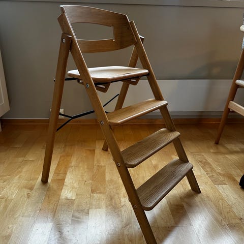 Selger en to pent/meget pent brukte KAOS klapp barnestoler i eik. Ingen sjenerende bruksmerker og pent brukt da vi har brukt de som ekstra. Har to stykker som har ligget hos besteforeldre.