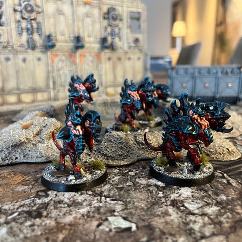 Warhammer Fantasy Chaos khorne demons hær miniatyrfigurer. Samling med flere enheter demoner på kvadratiske baser, alle ferdig montert og står på magnetiserte baser og nokken er påbegynt malt. Inkluderer både infanteri i metall og plast, samnt ein metall bloodthirster, og bloodchrushers. Som egnet til bruk i Whfb 6th, 7th eller 8th ed, eller 9th age men også the old world eller bare som samleobjekter.