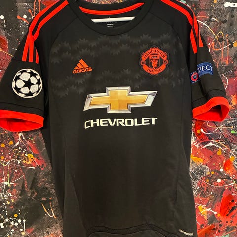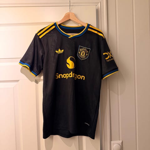 Adidas Manchester United fotballdrakt i størrelse 3XL. Drakten er svart med gullfargede detaljer, inkludert klubbemblem og sponsorlogo på brystet. Modellen er merket med Adidas og Parley, samt «FORTHEOCEANS» i halsen. Lett og pustende stoff som egner seg til fotball og annen trening, eller som supportereffekter til hverdagsbruk. Dette er tredjedrakten til Manchester United fra 2018/19-sesongen.