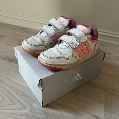 Adidas joggesko til jente i størrelse 30. Skoene har overdel i tekstil og syntetisk materiale i beige med rosa Adidas-striper og detaljer. Yttersåle i gummi med mønster for godt grep. Lukkes med lisser. Egnet som hverdagssko og til lett aktivitet for barn.