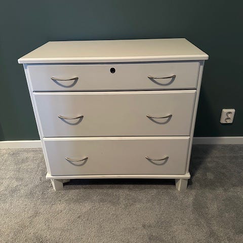 Selger den fine nattbord da passer ikke lenge. Store og dype skuffer og unik design. Ekte tre. Noen flekker inn i skuffende.