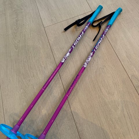 Skistaver i lengde 95 cm i hvit for langrenn til barn. Standard håndtak med stropper og trinser nederst på stavene.
