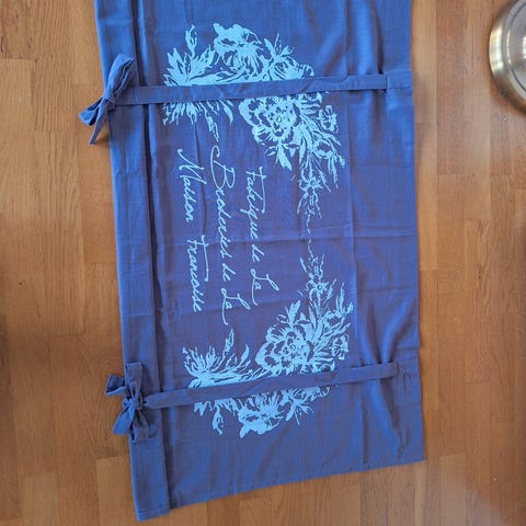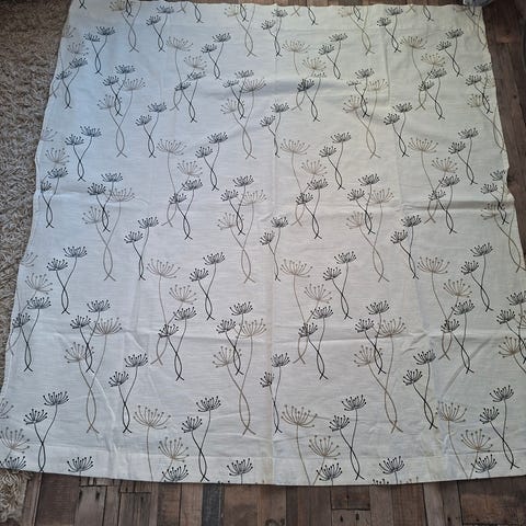 Har mørkegrå farget med mønster i gardina, det er antall 4 stk like lange.