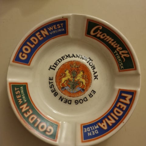Selger et meget flott og velbevart askebeger/sigarskål fra Porsgrunds Porselænsfabrik, produsert for Tiedemanns Tobaksfabrik. Dette er en sjelden mulighet for samlere av både norsk porselen og tobakkshistorie (reklame-nostalgi).