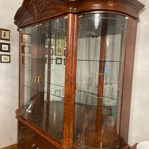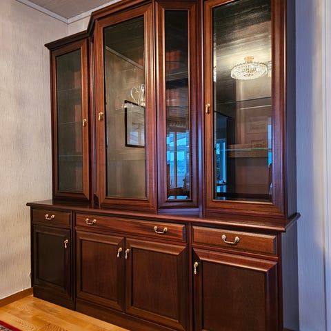 Skjenk og vitrineskap i tre i brun farge. Øvre del har vitrineskap med glassdører og åpne hyller på sidene. Nedre del har skapdører på hver side og flere skuffer i midten for oppbevaring. Passer til oppbevaring og utstilling av servise, glass og andre gjenstander i stue eller spisestue.