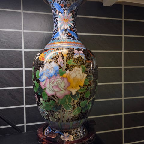 Elegant og dekorativ kunstvase med detaljert emaljearbeid og kobberdekor. Perfekt som blikkfang i entré eller stue.