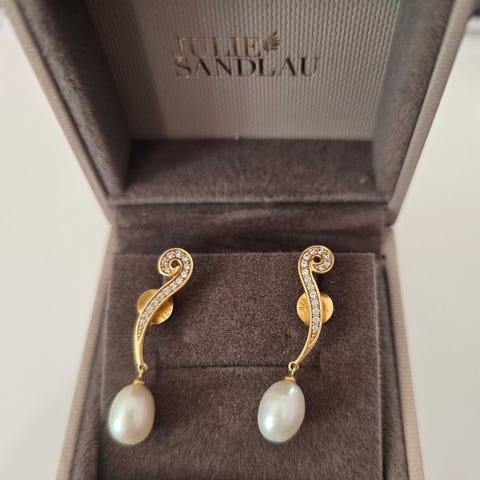 Vakre øredobber fra Julie Sandlau, lange perleøredobber i forgylt sølv med sandblåste overflater og fasettert vakker hvit zirkon , 2 hvite ferskvannsperler