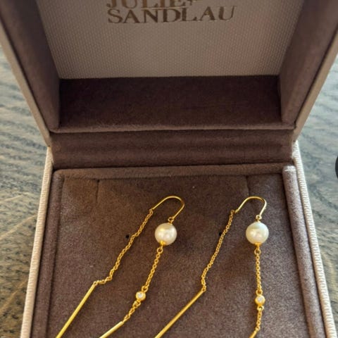 Vakre øredobber fra Julie Sandlau, lange perleøreringer i forgylt sølv med sandblåst overflate og fasettert vakker hvit zirkon. 2 hvite ferskvannsperler. Modellen heter: Ocean chain. Brukt 2 gange . Selges pga. feilkjøp. Vennligst gi et realistisk bud.