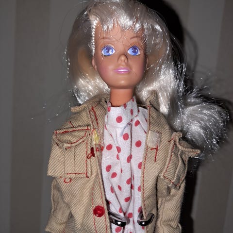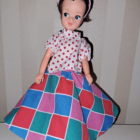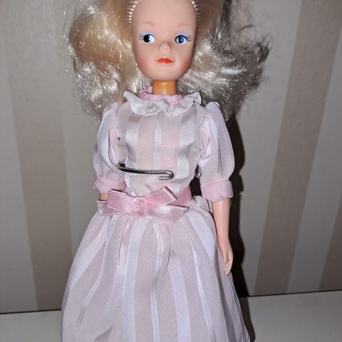 Vintage Sindydukke med originale klær! Kjolen bærer preg av slitasje foran. Se bilder for tilstand!