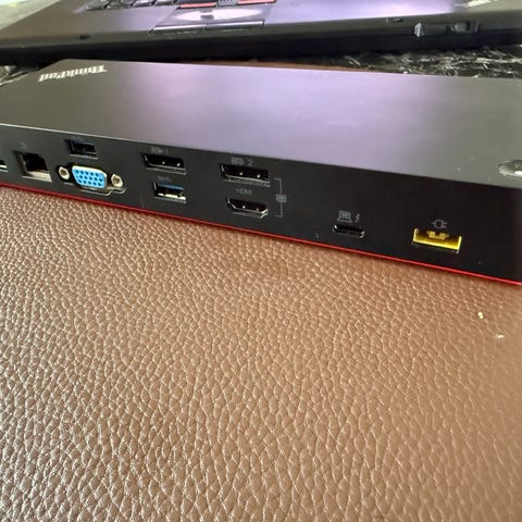 Dokkingstasjonen kobles til PC via Thunderbolt 3 og gir flere tilkoblingsmuligheter for skjermer og tilbehør. På baksiden finnes blant annet flere USB 3.0-porter, DisplayPort-utganger, HDMI-utgang, nettverksport (RJ45) og strømtilkobling. På forsiden er det ekstra USB-port og hodetelefonutgang.