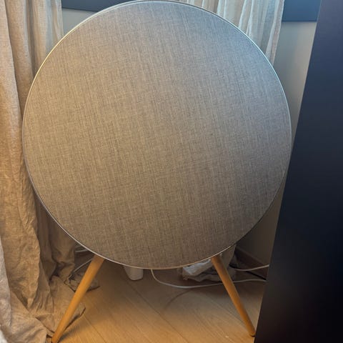 Pent brukt Bang & Olufsen høyttaler i rund utførelse, gulvstående modell på treben. Front i svart farge med perforert mønster. Egnet som lydanlegg i stue eller andre oppholdsrom der man ønsker en frittstående høyttaler med designpreg.