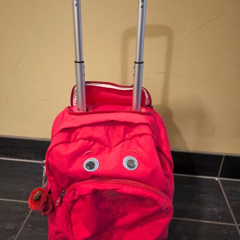 stor koffert med klær for barn og unge mennesker, flere par sko og støvler.
