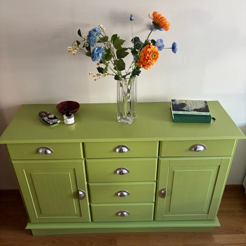 Selger en solid heltre skjenk som er nymalt i en moderne grønnfarge og oppgradert med nye messingknotter.