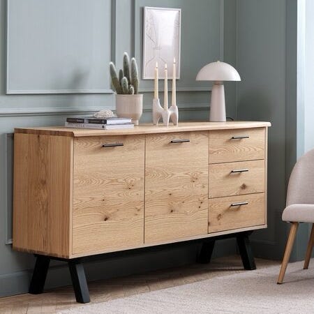 Tre skuffer og tre skap med hyller – masse oppbevaringsplass. Perfekt i stue, gang eller spisestue.