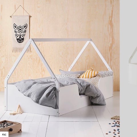 Sengeramme med ramme i massiv furu, sider i MDF og bunn i ubehandlet kryssfiner. Både furu og MDF er FSC-merket. Fargen er vannbasert. Den ene langsiden har en nedsenket kant slik at små barn kan klatre inn/ut selv.