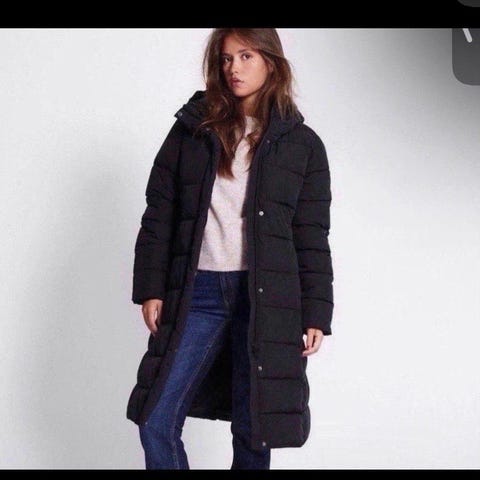 Lang, figursydd boblejakke. Sidelommer med glidelås. Hette med snøring. Glidelås og vindstolpe med trykk-knapper. Jakken er impregnertmed Bionic finish® eco, vilket gjør atden er vannmotstanden.