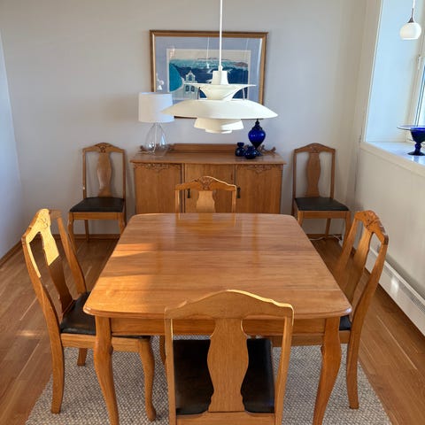 Et rektangulært spisebord, med tilhørende spisestoler (trenger nytt trekk), todelt vitrineskap, 3 stablebord, konsollbord ,speil og en krakk.