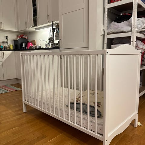 IKEA sprinkelseng i hvit utførelse. Klassisk barneseng med sprosser på langsidene og tette gavler. Passer standard madrass til sprinkelseng (ca. 60x120 cm). Madrass kan følge med om ønskelig, trenger en vask.
