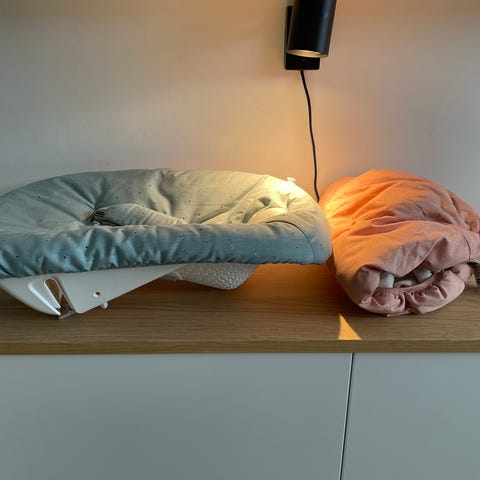 Lite brukt Stokke Tripp Trapp Newborn Seat i grå tekstil. Settet er et spedbarnssete som festes på Stokke Tripp Trapp-stol (selges separat) og er beregnet for bruk fra nyfødt og opp til 9 kg.