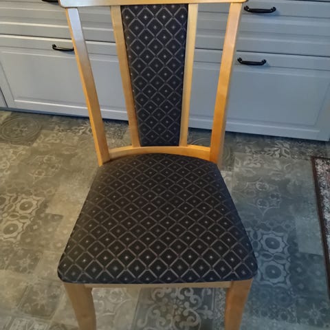 Stolene er pent brukt og er helt greie. Noen av stolene har begynt å flasse i trekket, som vist på det ene bildet.