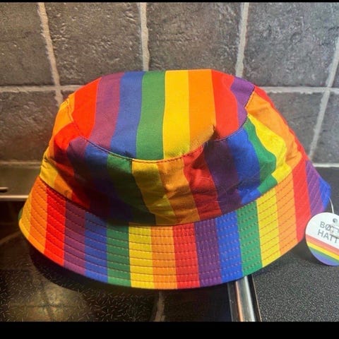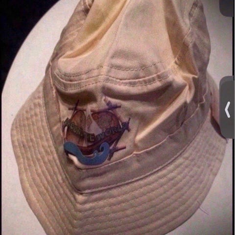 Beige bøttehatt med trykt motiv av skip og bølge på siden. Hatten har nedbrettet brem rundt hele og er sydd i lett stoff som egner seg til bruk i sol og mildt vær. Passer til hverdagsbruk, tur og fritidsaktiviteter. Størrelse og materiale er ikke oppgitt.