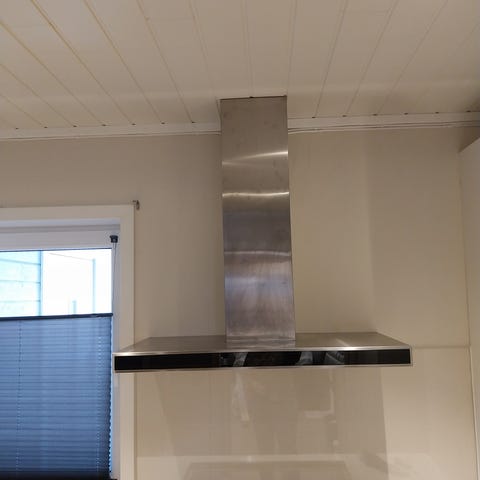 Ventilatoren har rektangulær hette med to fettfiltre under og et rett rør opp mot tak. Bredde på hetten er ca. 90 cm, dybde ca. 60 cm. Røret har firkantet tverrsnitt og er tilpasset montering mot vegg over komfyr eller platetopp.