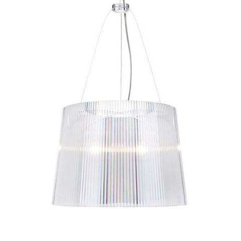 Flos Moon S2 pendellampe designet av Philippe Starck. Lampen har en skjerm i klart, rillet glass med en diameter på 50 cm og høyde på ca. 22,5 cm. Total opphengslengde er opptil 400 cm, justerbar etter behov. Pendelen gir nedadrettet og delvis diffusert lys gjennom glasskjermen og er egnet over spisebord, møtebord eller i oppholdsrom. Bruker standard lyskilde (se spesifikasjoner fra produsent for sokkel og maks watt).