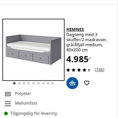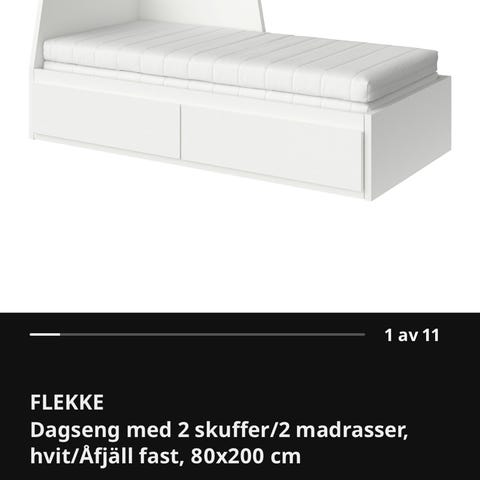 Seng med fjærmadrass, og en enkel skummadrass følger med. Ikke plass inni sengen til den.