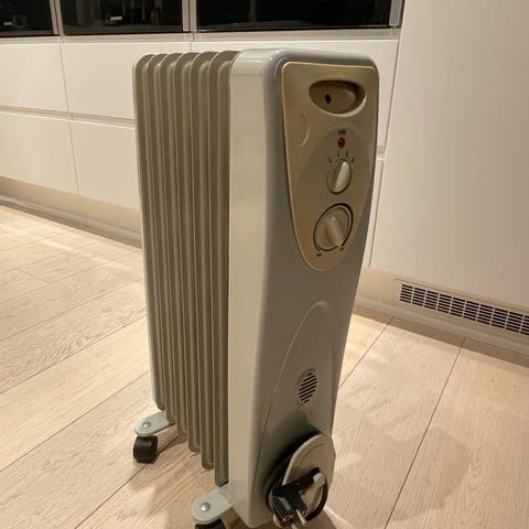 Oljefylt radiator på hjul i hvit farge. Radiatoren har flere ribber for jevn varmefordeling og er utstyrt med hjul for enkel flytting mellom rom. På fronten sitter betjeningspanel med bryter og dreiehjul for innstilling av varme. Strømkabel kan festes nederst på enheten når den ikke er i bruk. Egnet som tilleggsvarme i oppholdsrom, soverom eller andre mindre rom innendørs.