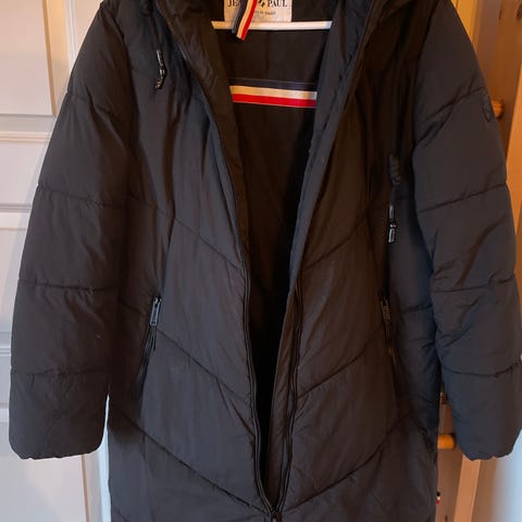 Varm, vattert kåpe med hette. Tåler litt regn. Brukt to ganger.