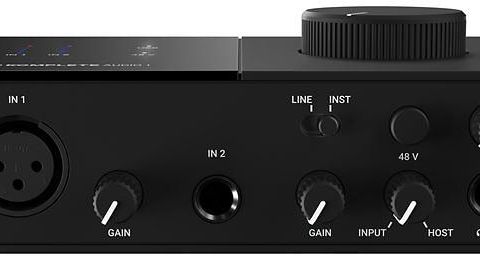 Audient EVO 4 lydkort med USB-tilkobling i svart. Kompakt lydgrensesnitt med stor hovedvolumkontroll på toppen og LED-indikatorer rundt hjulet. Fronten har to kombinerte XLR/jack-innganger for mikrofon eller instrument, hodetelefonutgang og ekstra jack-inngang. Baksiden har tilkobling for monitorutganger og hodetelefon. Egnet for innspilling og avspilling av lyd via datamaskin.