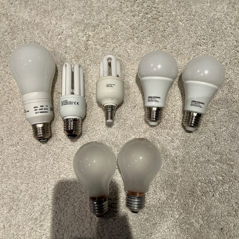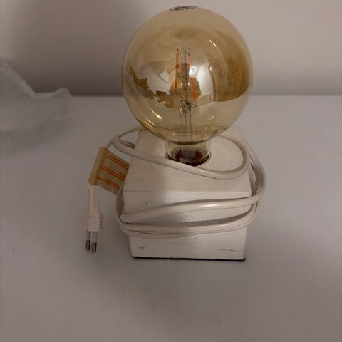 Hvit kube for dekor lyspære (eller hva en selv velger), maks 25 w. Ledning ca 175 cm, bryter. Str. ca 9 cm.