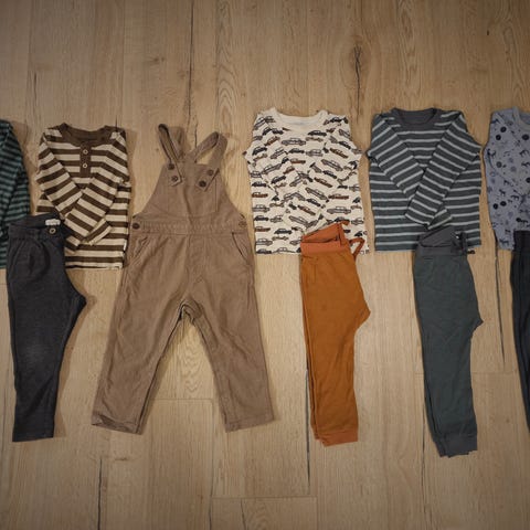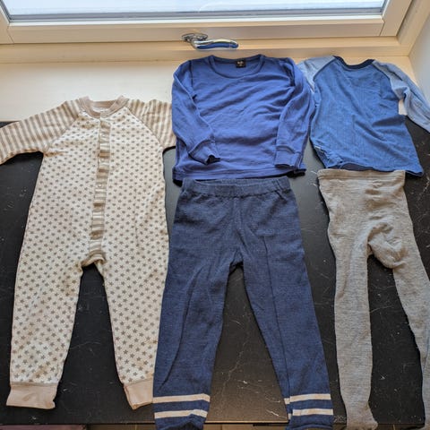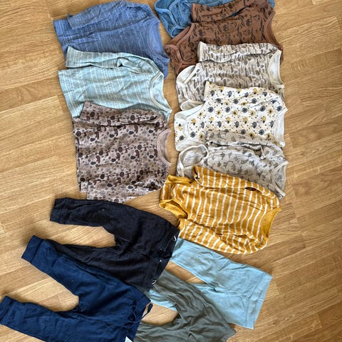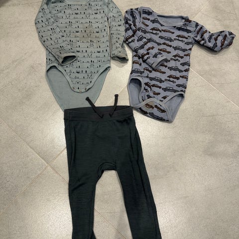 Hust & Claire barneklær i ull for gutt i størrelse 92. Sett med flerfargede plagg, blant annet body med bjørnemotiv og genser med bilmotiv, samt ensfargede bukser. Klærne passer til hverdagsbruk for små gutter og kan kombineres med annet barnetøy i samme størrelse.