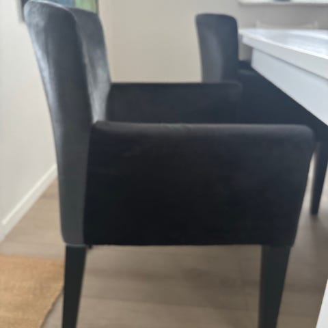Spisestoler i fløyel. Vanlig bruksmerker og noe flekker (går nok av ved litt vask). Veldig gode å sitte i, mye bruk igjen :)