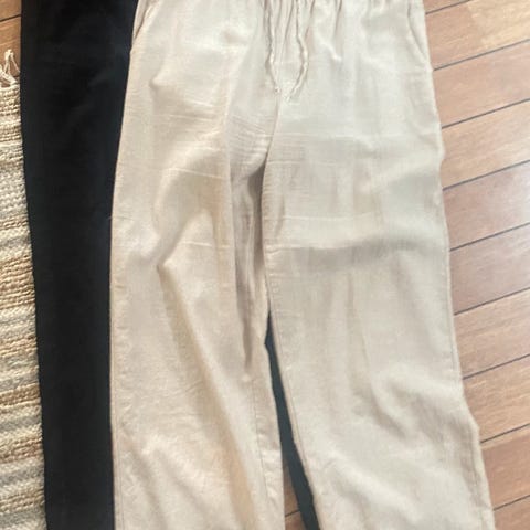 Nesten ubrukt bukse i 55 % lin og 45 % viskose fra Freequent selges for 100 kroner. 7/8 lengde, ankelbukse. Strikk og knyting i livet og lommer. Modellen heter fqlava. Se også mine andre annonser, kombinerer gjerne sending!