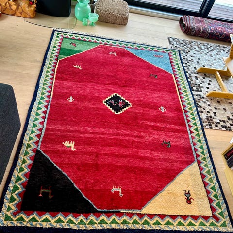 Teppet er i mønster Jaldar med hovedfarge Gammel Rosa - antall knuter 10*20 pr. tomme 2, kjøpt i 1989 og med sertifikat fra Galleri Finsrud (pristakst 15/7-1987 kr. 10.700). Litt solbleket på sidene.