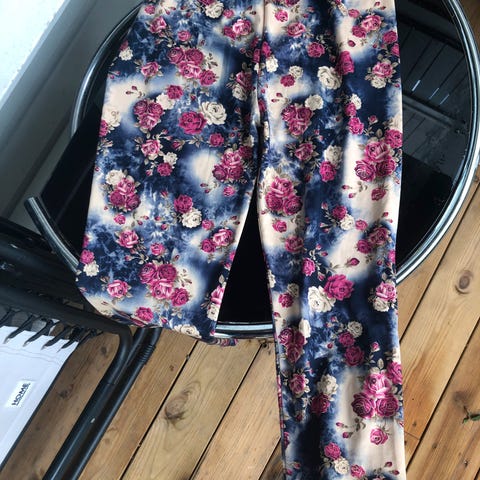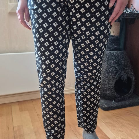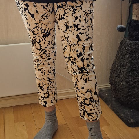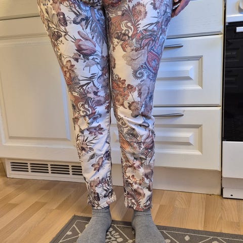 PM bukser for dame. Buksen er i bomull med flerfarget blomstermønster på mørk bunn. Klassisk 5-lommers modell med knapp og glidelåslukking foran. Modell: Andrea. Stoffet har stretch for bedre passform og komfort.