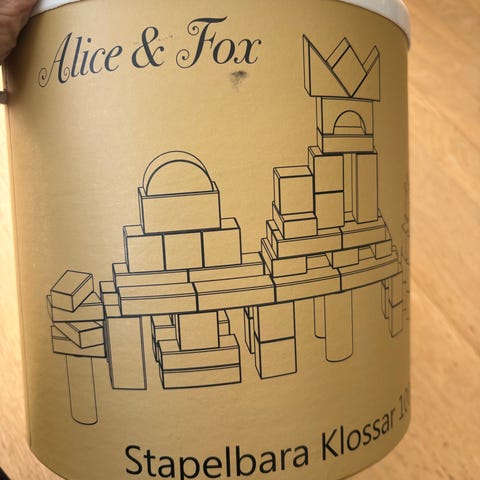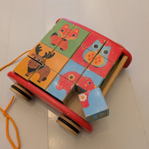 Dravogn med klosser du kan stable. Klossene har symboler, tall og bokstaver i ulike farger.