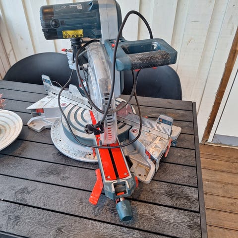 Godt brukt blå Bosch tils. Bra 24t blad. Løftehåndtak er defekt. Skjerm over blad må fikses. Sagen fungerer fint .