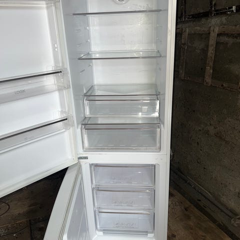 Bosch kombiskap i hvit utførelse. Kjøledelen har flere justerbare glasshyller, grønnsaksskuff og dørhyller for oppbevaring av flasker og mindre varer. Frysedelen nederst har tre transparente skuffer for oversiktlig lagring av frossenvarer. Egner seg som frittstående kombiskap på kjøkken, bod eller lignende.