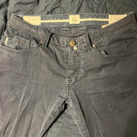 Selger et meget strøkent par med tramarossa i en fin mørkeblå farge med nydelige detaljer.
