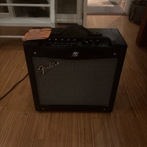Fender Frontman 10G gitarforsterker. Kompakt forsterker egnet for elektrisk gitar, med frontpanel som typisk inkluderer volum-, gain- og tonekontroller samt inngang for gitar. Passer til øving hjemme eller i mindre rom der det er behov for enkel og funksjonell lydforsterkning.
