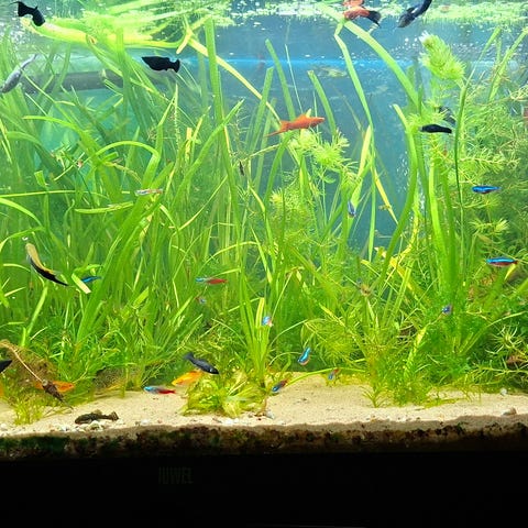 Følger med alt man trenger , både mat , alt man trenger å tilsette i vannet … masse pynt og fødeklar. Er en veldig god pumpe og luft pumpe til bobler.. følger også med green killer pumpe som holder vannet krystallklart , Varmekolbe, temp måler, av fisk er det 3 stk siamesiske algespisere, ansistrus albino (Hann) 2 skjørte tetra , 3-4 neon tetra, 2 platy ..på noen av bilden ser man vannet med svevealger, (da er vannet helt grått.. ) og hvor klart det er med green killer pumpen på på de andre bildene… verdt pengene den👍følger med pumpe også til vann skifte , og flere håv’er +++ Akvariet har ingen riper i glasset.