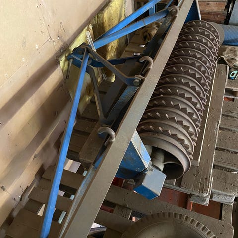 Transportbånd kjedetransportør i stål. En lang, frittstående kjedetransportør med stålramme og integrert motor-/styringsboks i den ene enden. Består av to parallelle kjeder med føringer langs hele lengden, montert på benstativ for bruk på gulv. Egnet for intern transport av varer eller komponenter i verksted, lager eller produksjonsmiljø. Materialet fremstår som metall/stål, og konstruksjonen er åpen for enkel tilgang til kjeder og mekaniske deler.