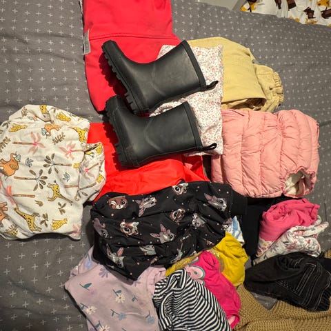 Klespakke med klær i forskjellige størrelser fra 86-104. Selges kun som komplett pakke. Inneholder regnbukse og-jakke, pysj, kjole, 4 tskjorter, 7 gensere, 2 cardigans, 1 bukse, 1 shorts, 1 body.
