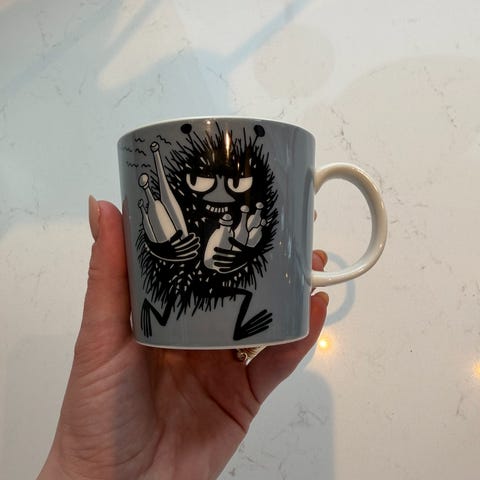 Arabia Mummi kopp i keramikk med rosa bakgrunn og motiv fra Mummidalen.