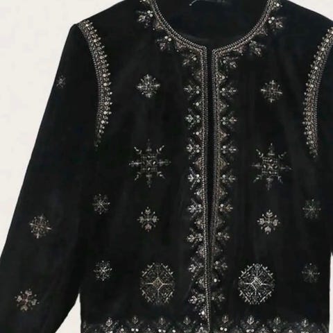 Vintage croppet dressjakke/blazer med broderi, perler og pompoms (i mangel på bedre ord). Noen av pompomsene har noen løse tråder. Lukkes med en hempe midt foran 🖤
