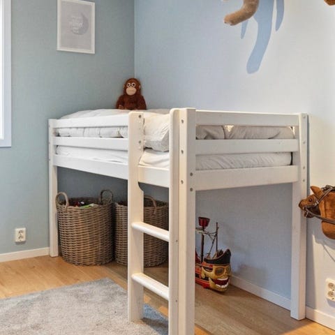 Fine lille hus med tag og hvide tremmer/gelænder rundt om sengen – giver en rigtig hule-følelse